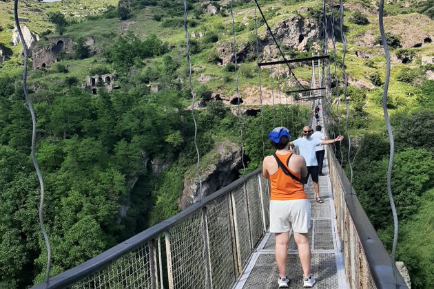 Дальше - драйв. Водопад Шаки, низвергающийся с высоты, и пещерный город Старый Хндзореск, куда мы попадем по длинному подвесному мосту. Ощущение, будто шагнул в другое измерение, в эпоху, когда люди высекали дома прямо в скалах.