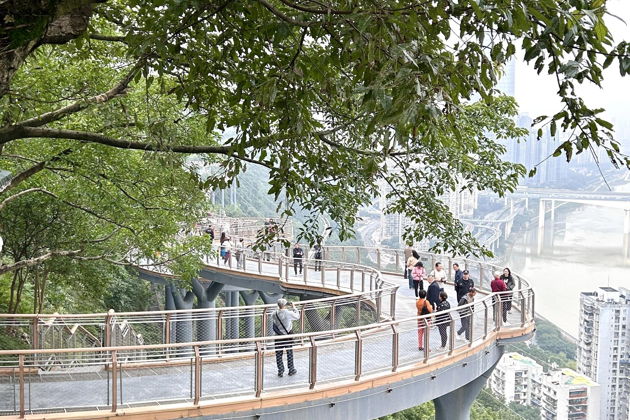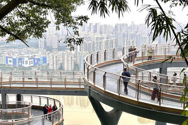 Начнем на станции Eling. Оттуда - прямой путь в парк и на его знаменитый скайуок. Вид отсюда - это Чунцин в чистом виде: слоистый, как геологический срез, с реками внизу и горами по краям. Город буквально под ногами.
