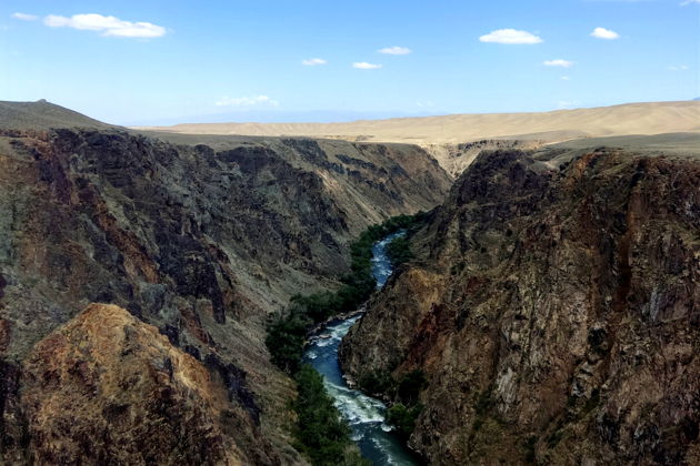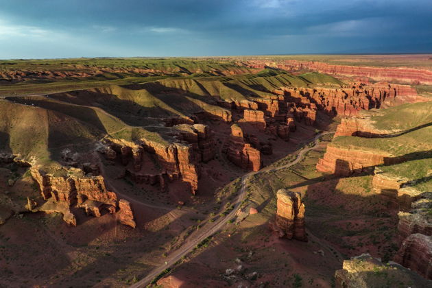 Представьте: вы стоите на краю Чарынского каньона. Внизу - Долина Замков, эти сюрреалистические башни и шпили, выточенные ветром за миллионы лет. Вид - просто огонь. Спускаемся к самой реке Чарын, чтобы почувствовать масштаб. А потом - резкий контраст. Черный каньон. Суровый, молчаливый, почти инопланетный пейзаж, куда редко заглядывают туристы. Тишина здесь - особая, давящая и в то же время очищающая.