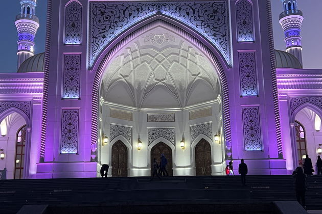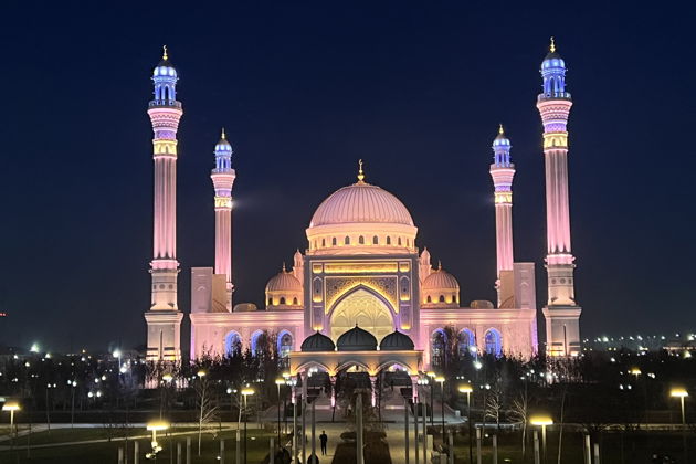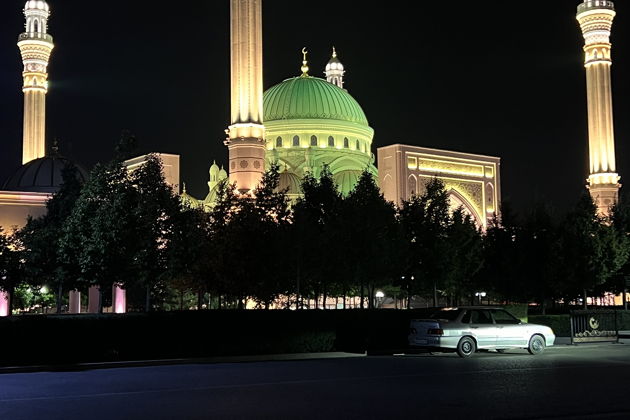 А в Шали нас ждет гигант - самая большая мечеть в Европе, «Гордость мусульман». Комплекс, способный вместить целый стадион - до 70 тысяч человек. Его масштабы в ночной иллюминации трудно описать словами.