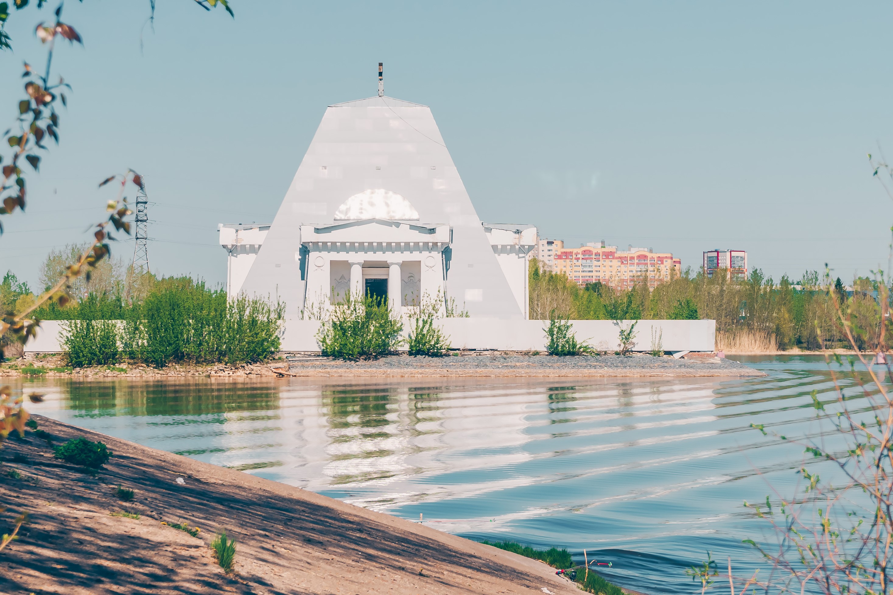 Храм-памятник в честь Нерукотворного Образа Спасителя, расположенный в Казани, представляет собой православный мемориал XIX века, посвященный воинам, павшим при взятии города в 1552 году. Ключевой особенностью объекта является его функция братской гробницы, где покоятся останки нескольких тысяч защитников. Архитектурно здание выполнено в виде двадцатиметровой усеченной пирамиды, облицованной белым камнем, с четырьмя портиками и кельями по углам. Под основным пирамидальным объемом находится склеп с обширным захоронением. В современный период после реставрационных работ 2020-х годов памятник, стоящий на острове, передан Русской Православной Церкви, в нем возобновлены регулярные богослужения.