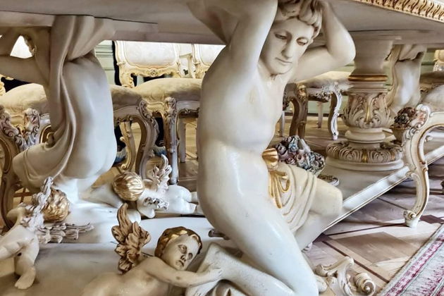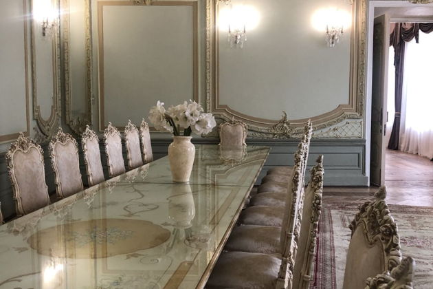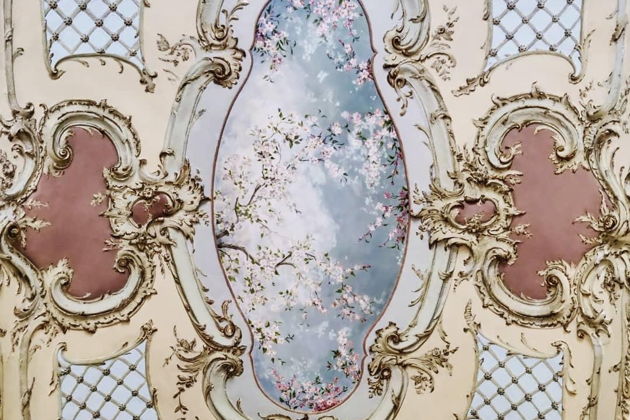 И вот что самое удивительное - интерьеры сохранились практически идеально. Люстры, торшеры-факелы, узорные паркеты и дубовая мебель. Такая аутентичность в центре Москвы - редкость. Вы увидите действующие камины, старинные замки на дверях и изящную плитку. А в столовой вас ждет сюрприз - стол без ножек в стиле рококо и… цветущая сакура на потолке. Да-да, вы не ослышались.