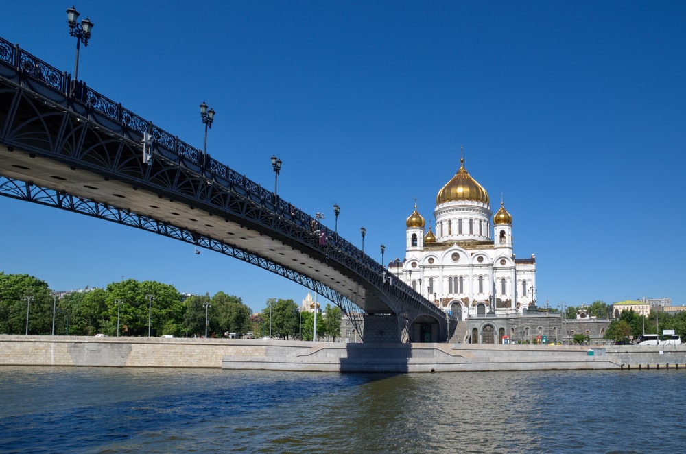Пешеходный мост через Москву-реку, Патриарший, открыли в 2004 году по проекту архитектора М.М. Посохина, художника З.К. Церетели и инженеров А.М. Колчина, О.И. Чемеринского. Мост связывает храм Христа Спасителя с тремя набережными и расположен близ метро «Кропоткинская». После продления в 2007 году мост достиг улицы Большая Якиманка. С 2009 года объект входит в туристическую зону «Золотое кольцо Москвы» и известен как место записи новогодних обращений президента Дмитрия Медведева в 2008-2011 годах. Арочная однопролетная конструкция имеет длину 203 метра, ширину пролета 105 метров, а судовой ход составляет 54 на 12,5 метра. Стилобатная часть поднята на 10 метров над Болотным островом. Строители применяли метод поворота ферм, собранных на берегах. Освещение обеспечивают сотни светильников и прожекторов, а колорченджеры меняют цвет арок каждые 15 секунд. Современные планы включают создание аллеи патриархов из 16 скульптур и обустройство пространства под мостом площадью 2,1 га для музейных и выставочных объектов, а также заведений общепита.