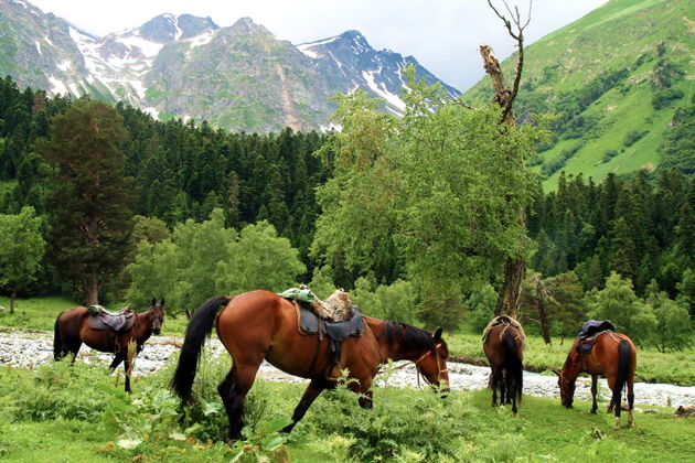 Преодолели? Добро пожаловать в ущелье Адыр-Су, которое многие называют самым живописным на Северном Кавказе. «Река с хребта». Наш путь лежит вдоль нее, мимо хвойных лесов, сменяющихся березовыми рощами, а затем и альпийскими лугами. Целых три тысячи видов растений, между прочим. Через тринадцать километров - альплагеря «Уллу-Тау» и «Джайлык», основанные в тридцатых годах прошлого века. Но перед этим - небольшой детур в прошлое.