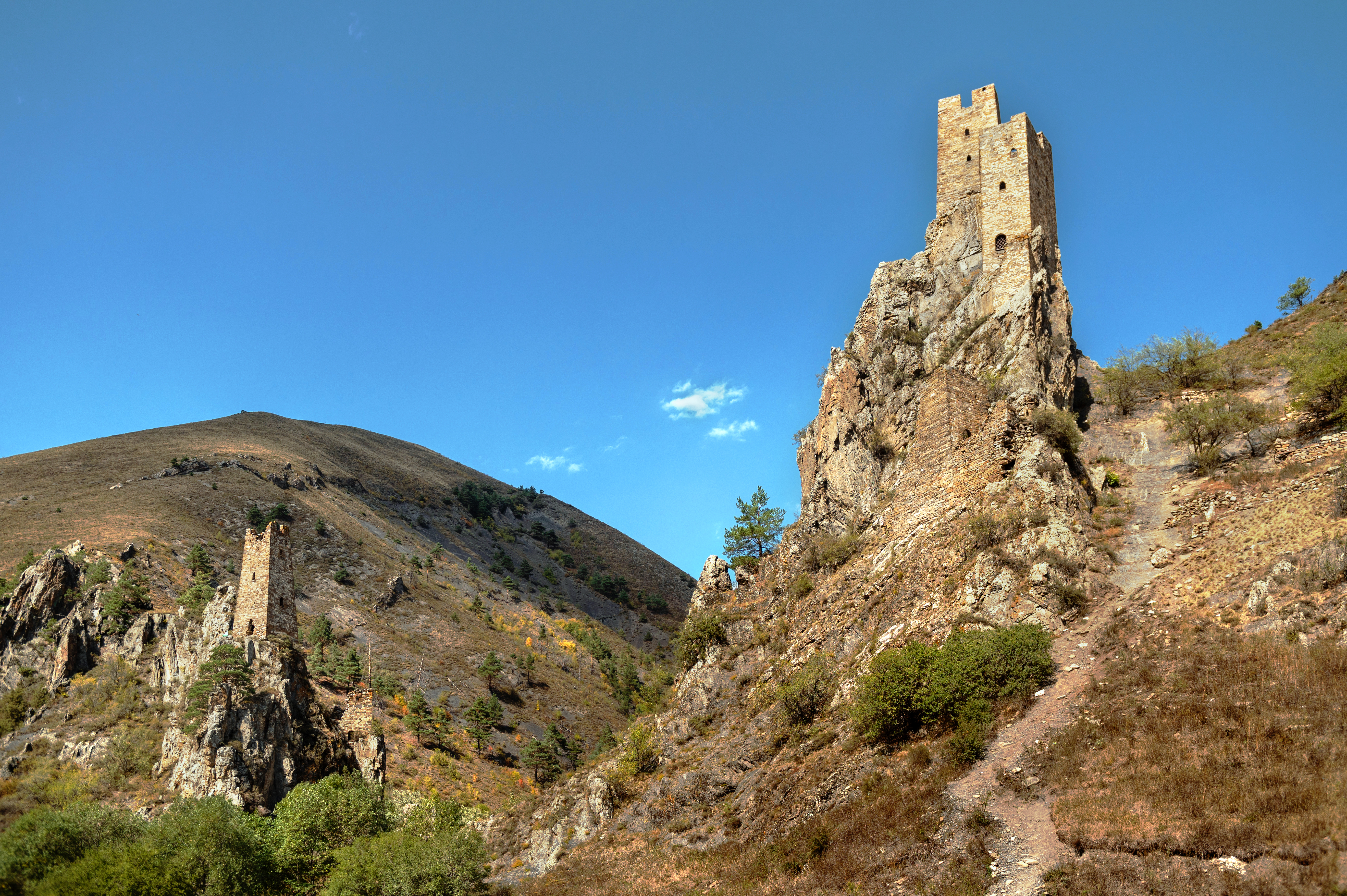 На южном склоне священной горы Цей-Лоам, прозванной ингушским Олимпом, в Ассинском ущелье Джейрахского района Ингушетии возвышается Башенный комплекс Эгикал. Крупнейший средневековый ансамбль региона объединяет более 50–90 оборонительных, полубоевых и жилых башен XI–XVII веков. Строители клали камни вручную, без цемента и гвоздей, создавая сухую кладку. Высота достигает 25–30 метров, бойницы узкие, орнамент крестообразный. Одна боевая башня стоит целой - 27 метров, руинированы свыше 60, склепов насчитали более 20, плюс святилища и стены. Ингуши звали его "городом предков", музеем под небом: башни служили крепостями, домами, усыпальницами до середины XX века. Комплекс лежит 85 км южнее Магаса, 25 км восточнее Джейраха, у реки Ассы. Из Пятигорска мчатся 4–5 часов по горным трассам через поселки, долины - берите арендованное авто или трансфер. Экскурсии от 4200 рублей охватывают Джейрахское ущелье. Пройдите кольцевой маршрут 2,5 км за час, в утро, день или вечер.