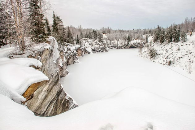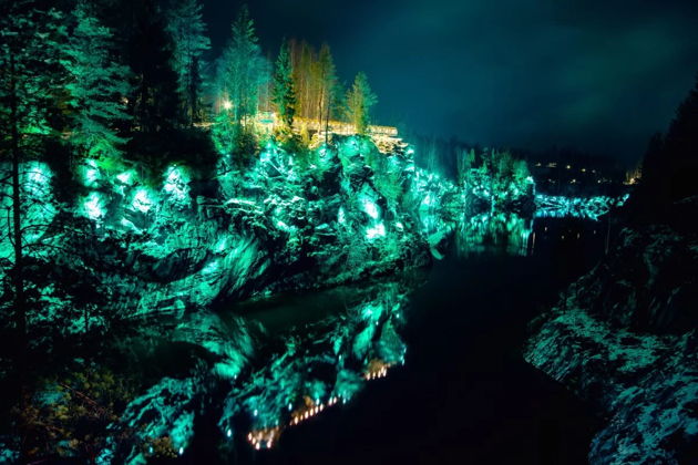 - Мраморный каньон Рускеала - бывшие каменоломни, заполненные изумрудной водой. Подвесные мостики и тропы позволяют рассмотреть разноцветные мраморные слои. Зимой здесь заливают самый большой каток в Карелии.