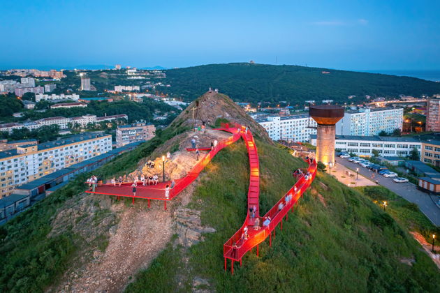 Начнем с Алексеевской сопки - отсюда как на ладони исторический центр. Дальше - Тюменская и проспект Красоты, откуда бухта Золотой Рог предстает во всей красе. Крестовая подарит панораму на полуостров Шкота, порт и грандиозный Русский мост. На Орлиной заберемся по оборудованной лестнице к точке в 199 метров. А финальный аккорд - Бурачок с ее трехсотметровой лестницей, открытой пару лет назад. Вид отсюда - просто вау: бухты Диомид и Улисс, Золотой мост, центр и Русский остров. И да, все мосты, заливы и острова вы увидите вживую.