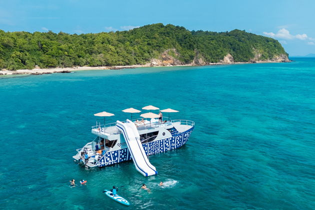 - Премиум-катамаран с зоной отдыха, мини-баром, DJ, горкой, надувным бассейном, SUP и прозрачными каноэ