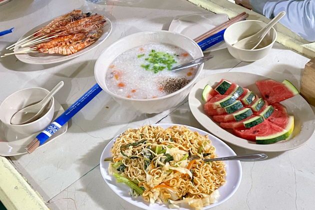 А после - ужин на палубе. Не изысканный ужин в ресторане, а что-то душевное и простое. Жареные креветки, лапша, горячая рисовая каша с тем самым кальмаром и свежие фрукты. Все это - под мерцание огней на берегу и в компании новых знакомых. В стоимость уже входит легкий ужин и вода.