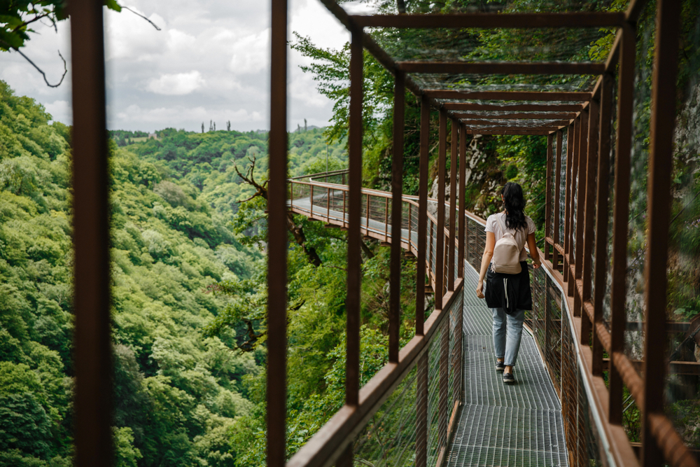 В Хонском районе Имеретии, Грузия, лежит каньон Окаце, известный также как Окатсе, в 50 км от Кутаиси и 165 км от Батуми. По тропе длиной 1–1,4 км с подвесными мостами и лестницами спускаются над пропастью, 6 км пешком или на внедорожнике, чтобы увидеть реку в ущелье, 12-метровый водопад и панорамы с смотровых площадок. Касса в визит-центре у села Зеда-Горди открыта ежедневно, вход около 70 GEL с лодкой и внедорожником в турах, с 2018 года проверяют безопасность. Из Батуми едут 3–4 часа: маршрутка до Кутаиси (20–25 GEL), автобус до Зеда-Горди (5 GEL, около 16:00). Экскурсии удобны - от 33–65 евро за 8–12 часов с русским гидом, сочетают с Мартвильским каньоном, пещерой Прометея, водопадами Кинчха или источниками Нокалакеви. Учитывайте нагрузку от лестниц и мостов.