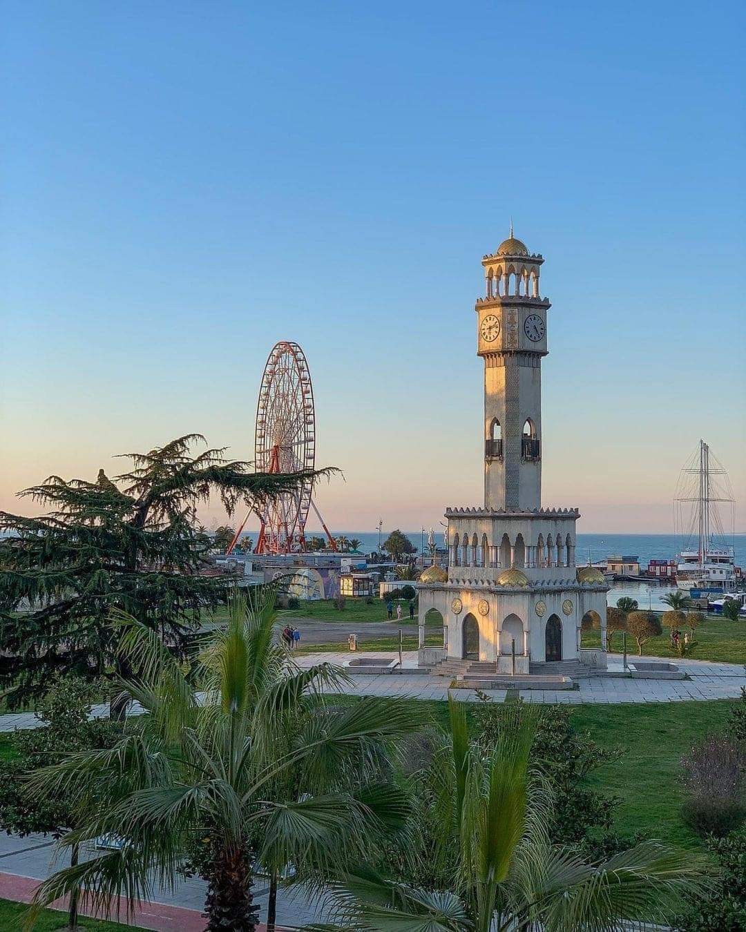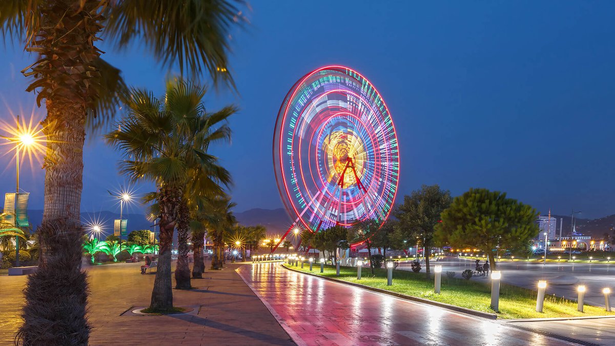 В парке чудес Miracle Park на набережной Батуми высотой 55 метров возвышается колесо обозрения, популярное у отдыхающих на Черном море. Итальянская фирма Visa International ESL спроектировала аттракцион, установила его в 2011 году на железобетонном основании. Сорок кабин с крышами и бортиками вмещают по шесть человек, всего 240 пассажиров за оборот в десять минут с видами порта, города, окрестностей. Билет обойдется в десять лари, малыши до семи лет войдут бесплатно. Поблизости скульптура Али и Нино символизирует дружбу Грузии с Азербайджаном, башня алфавита, фонтан чачи, маяк манят к прогулкам. После заката подсветка колеса и улиц усиливает панораму, вечером здесь многолюдно. В отеле Le Méridien крутится второе колесо на сотне метров.