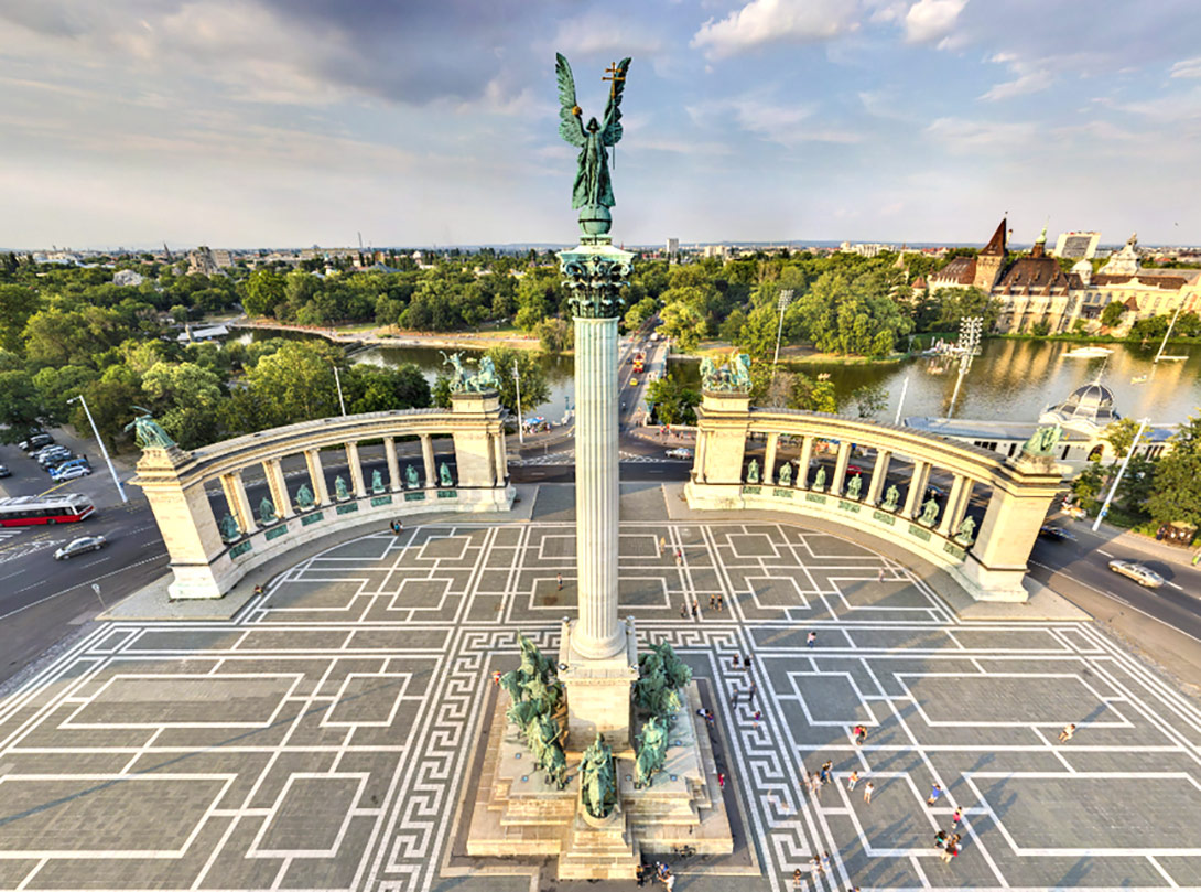 В центре Пешта, у входа в парк Варошлигет, расположена монументальная Площадь Героев. Ее архитектурный ансамбль был создан к 1896 году для празднования тысячелетия Обретения родины венграми. Доминантой является 36-метровая колонна с фигурой архангела Гавриила, установленная в честь этого юбилея. У ее подножия размещены конные статуи вождей мадьярских племен во главе с князем Арпадом. За колонной расположены две полукруглые колоннады длиной 85 метров каждая, представляющие памятник национальным героям разных эпох. Перед центральным монументом находится мемориальная плита солдатам, павшим в мировых войнах. Площадь обрамляют здания Музея изобразительных искусств и выставочного зала "Мючарнок".