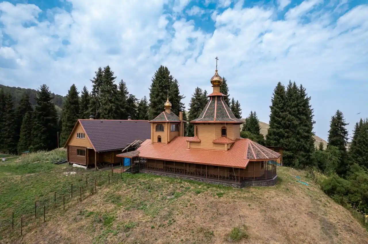 В живописном Аксайском ущелье Национального природного парка близ Каскелена раскинулся Серафимо-Феогностовский Аксайский Скит на высоте 1850 метров над уровнем моря. Пять иеромонахов - Серафим Богословский, Феогност Пиворов, Анатолий Смирнов, Пахомий Русин и Ираклий Матях - основали его в 1918 году, спасаясь от гонений после революции. Монахи вырыли пещеры для молитв и продуктов, служили в деревянной келье, а верующие добирались сюда пешком. 11 августа 1921-го красноармейцы, приюченные в скиту, убили Серафима и Феогноста, обитель стала их усыпальницей. Власти закрыли ее в 1922-м. С 1993 года скит возобновил работу, Синод утвердил восстановление в 1996-м. Храм в форме корабля с куполом и колокольней заложили 28 сентября 1999-го, купола возвели к августу 2001-го, верхний этаж освятили 11 августа 2008-го во имя мучеников. Ремонт завершили в 2023-м. Паломники молятся, туристы гуляют по парку, изучают историю и деревянно-бетонную архитектуру. Святых прославили в 2000 году.