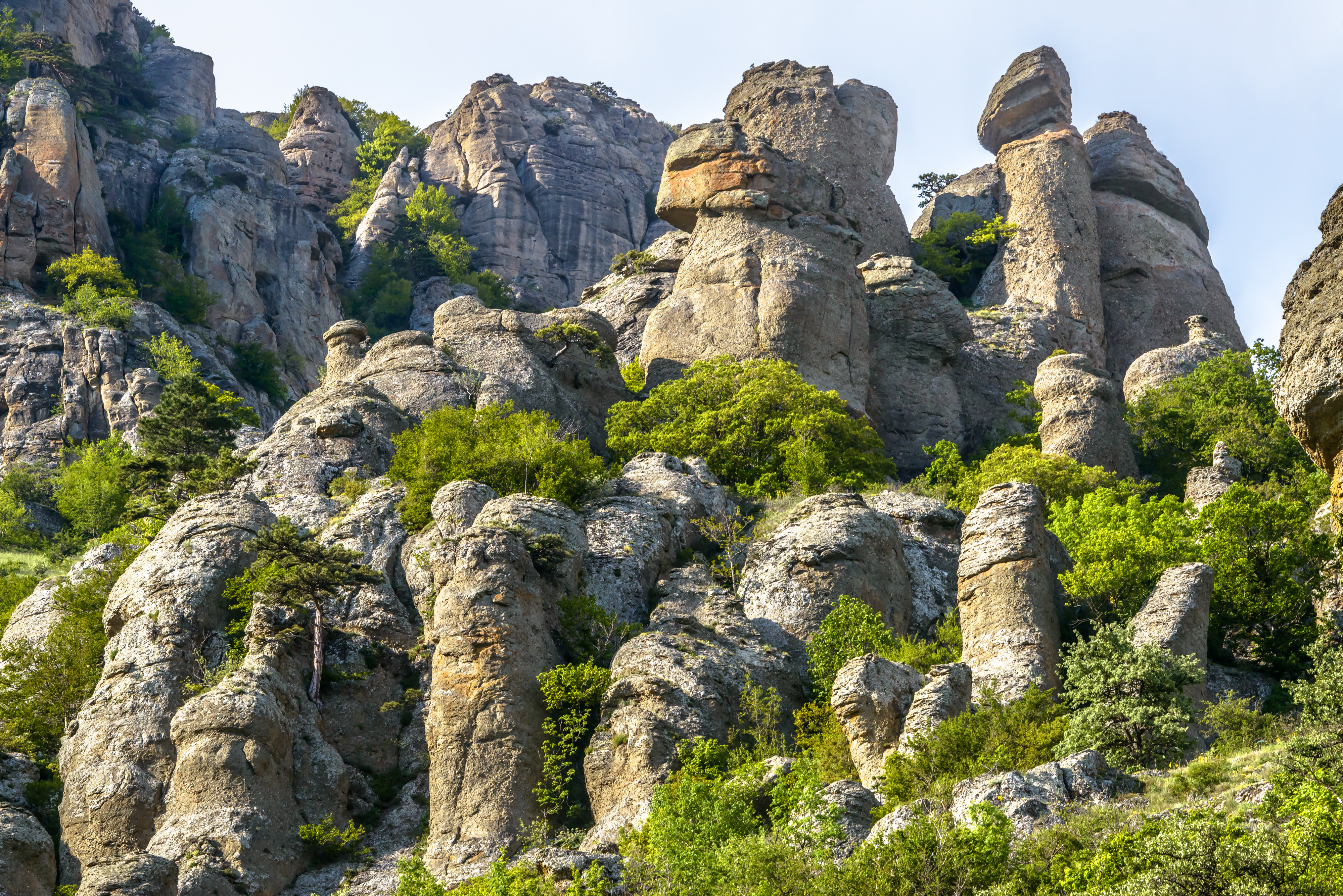 Где-то в Крыму, на склонах Демерджи, притаился уголок, который местные прозвали Долиной Привидений - и неспроста. Представьте себе: ветер столетиями вытачивал причудливые скалы, превращая их в каменных истуканов. То ли это древние воины застыли в вечном дозоре, то ли сказочные существа - каждый видит что-то свое. Особенно жутковато становится, когда над горой нависают тучи - тогда эти изваяния и правда кажутся порталом в другой мир.