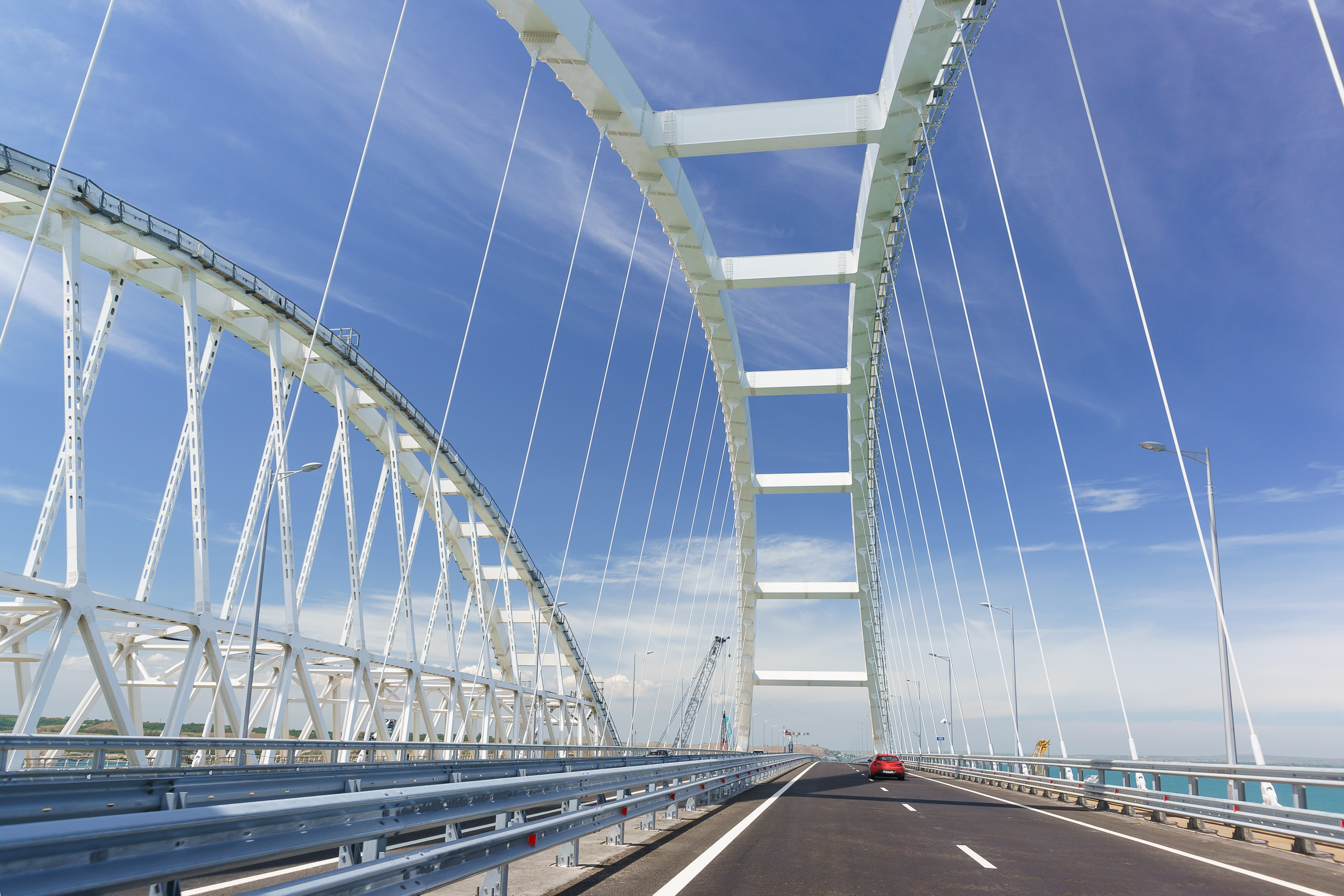 Транспортный переход через Керченский пролив соединяет Керченский и Таманский полуострова. Крымский мост включает параллельные автодорожную и железнодорожную трассы, общая длина которых составляет 19 километров. Сооружение стало самым протяженным мостовым переходом, построенным Россией. Его возведение началось в 2010-х годах для обеспечения сухопутной связи с Крымом. Автомобильное движение открыли в 2018 году, а железнодорожное - в 2019-2020 годах. В 2022 и 2023 годах конструкция подверглась повреждениям в результате взрывов.