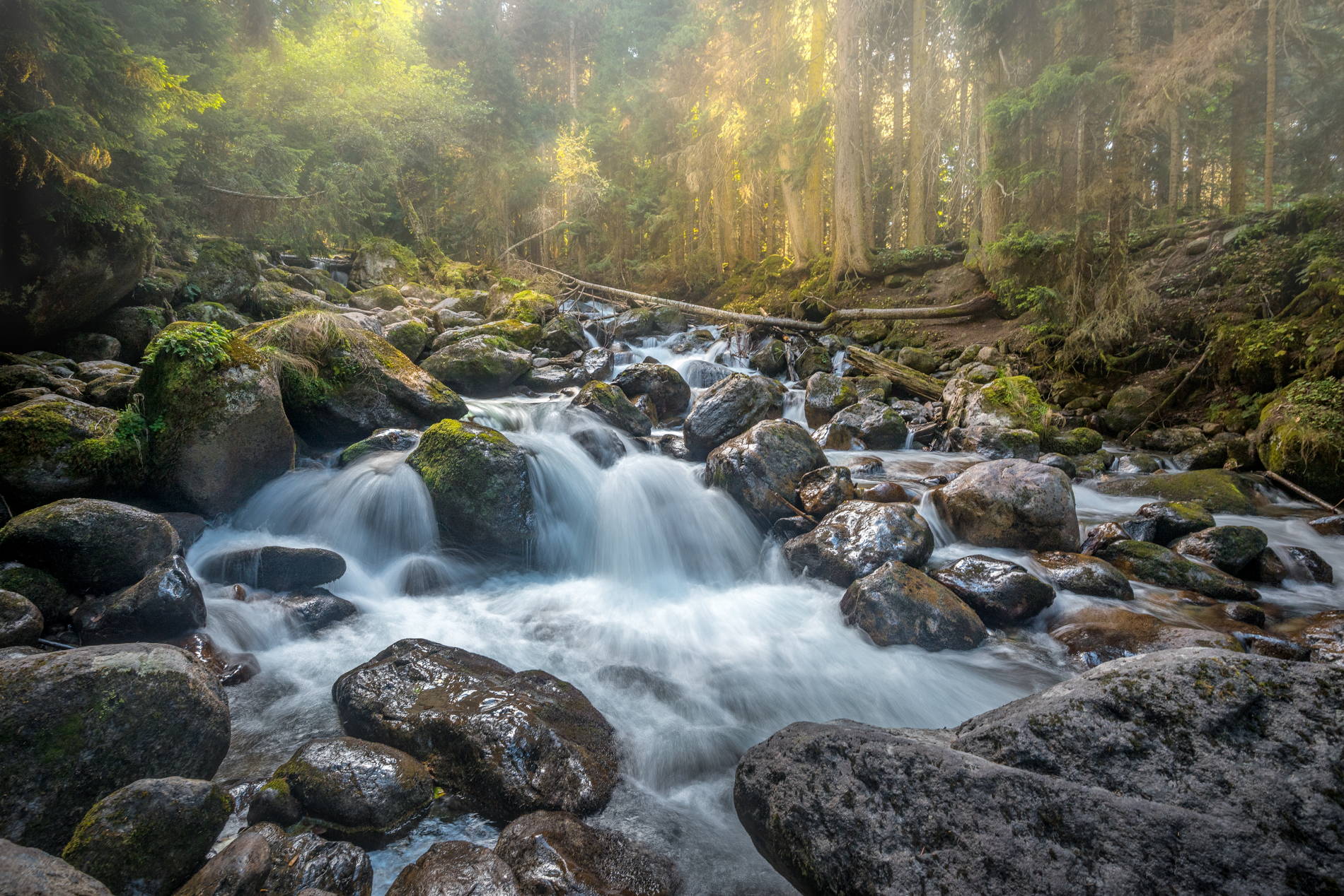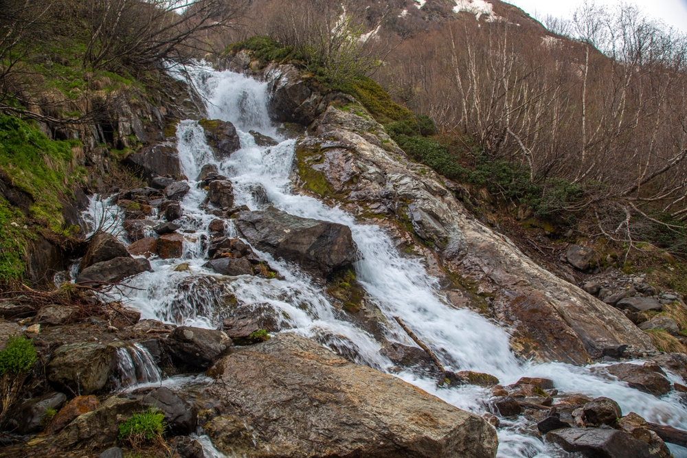 В Тебердинском заповеднике под Домбаем в ущелье реки Аманауз Суфруджинские водопады формируют три каскада общей высотой около 200 метров. Река несется с ледника Суфруджу выше 3000 метров, рождая потоки высотой 60-80 метров у первого и 250 метров у Малого второго, где струи белыми косами сеют гул и брызги. Третий открывается осенью. Вода держит +5°C даже летом. От жилых домов Домбая ведут тропы 5-7 км через хвойный лес, с камнями и бродами через реку. Конец весны-начало лета усиливает мощь таянием. Солнце множит радуги до трех, Чертова мельница вертит водоворот в обрывах. Доступны с мая по октябрь.
