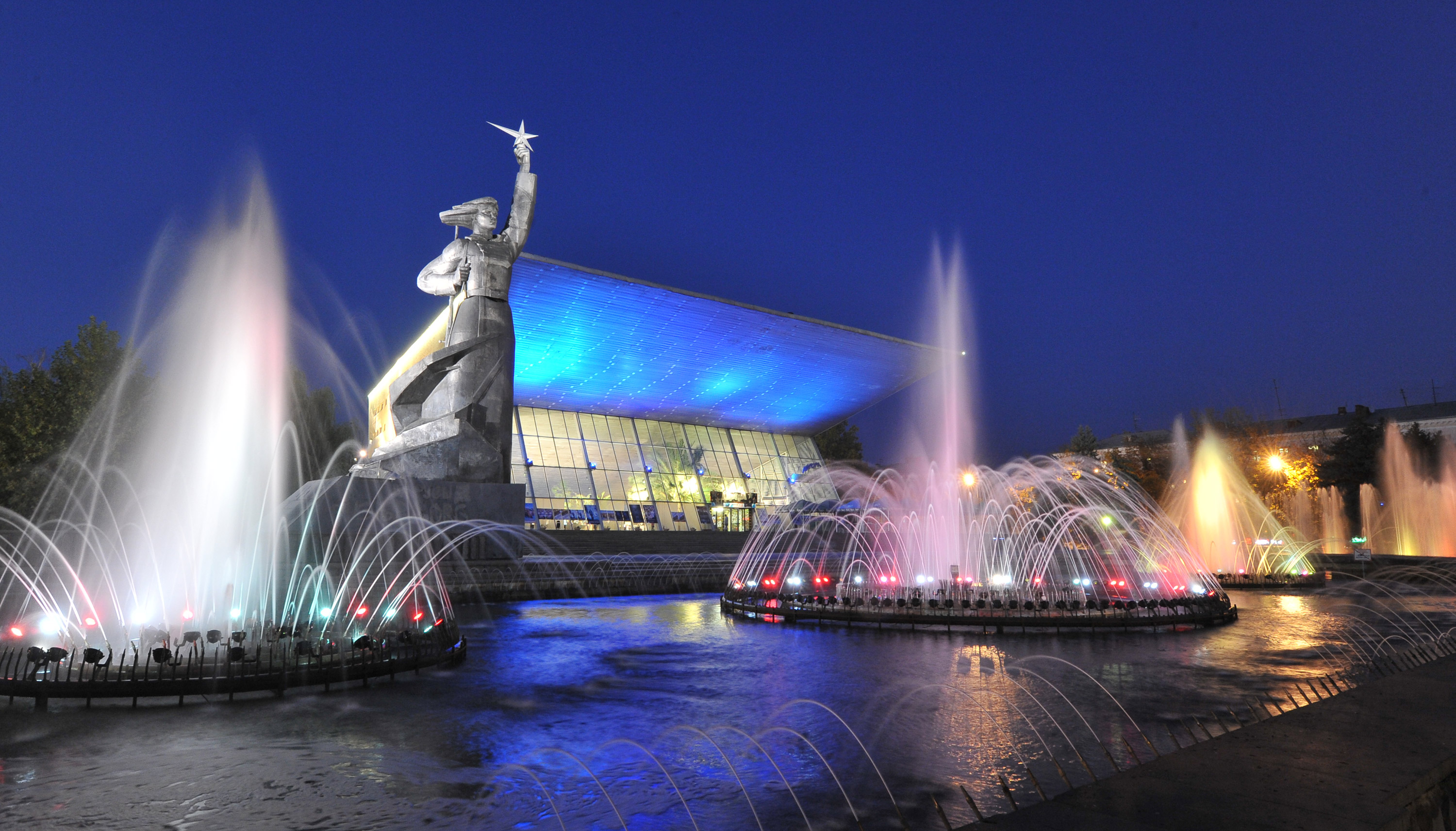 Театральная площадь Краснодара, она же Главная городская, обрела в сентябре 2011 года ко Дню города светомузыкальный плоскостной фонтан. 377 струй вздымаются на 30 метров, высоту девятиэтажки, порождая свыше 400 эффектов под 640 светодиодами и управлением 377 насосов. Площадь в 1225 м² днем брызжет из-под земли для игр и прохлады, вечером по пятницам с выходными с 20:30 устраивает двухчасовые шоу с классикой или поп-музыкой, танцующими водами и подсветкой. Когда фонтан спит, здесь гремят праздники для 50 тысяч гостей. После фан-зоны ЧМ-2018 ажиотаж усилился, хотя паузы случались в 2019-м, статус на 2026-й проверяйте на месте или в Яндекс.Картах, 2GIS. В городе искрятся каскадный "Аврора" у кинотеатра с 21-метровыми струями и фонтан на Невкипелого.